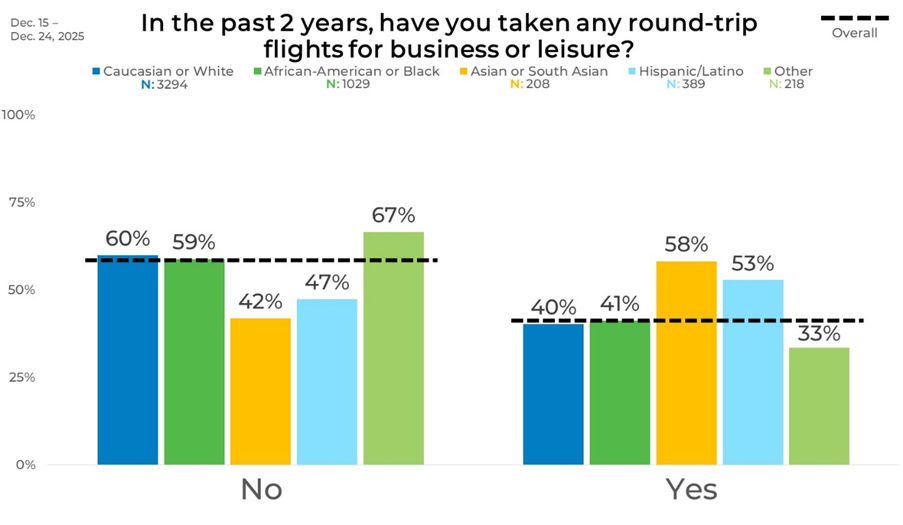 There are some notable differences when looking at the data by ethnicity. 40% of Caucasian report taking a round‑trip flight while 60% say they have not. African Americans reported a similar level. Both Asians and Latinos reported higher levels of air travel.