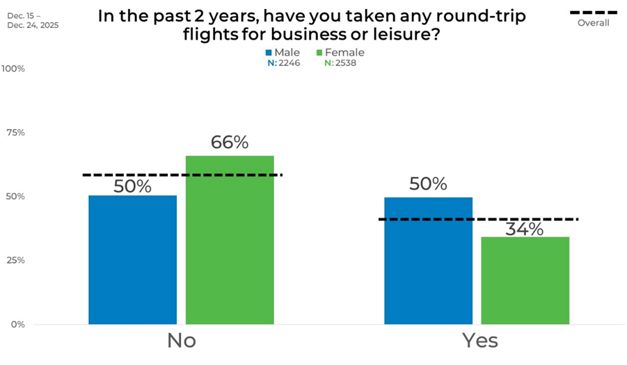 Breaking down the data by gender shows notable differences between men and women. Among men, the results are evenly split: 50% report taking a round‑trip flight in the past two years and 50% say they did not. Among women, the pattern shifts toward fewer flights, with 34% saying they have taken a round‑trip flight compared with 66% who report they have not.
