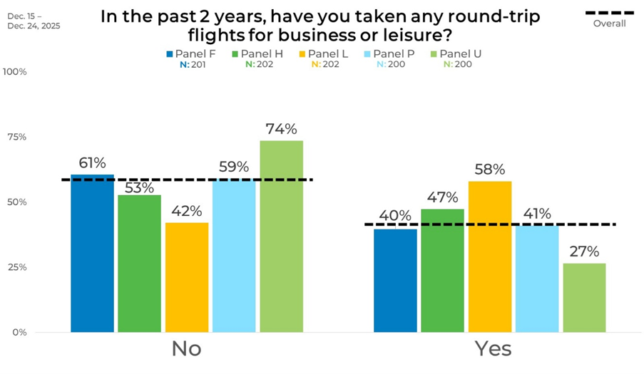 Some of the biggest variations were found when we broke the data down by panel source. Panel L shows the highest share reporting a round‑trip flight, with 58% saying they have flown and 42% saying they have not. At the other end, Panel U reports the lowest share of recent flights, with 27% saying they have taken a round‑trip flight and 74% saying they have not, a difference of more than thirty percentage points compared with Panel L. The remaining panels fall between these two points.