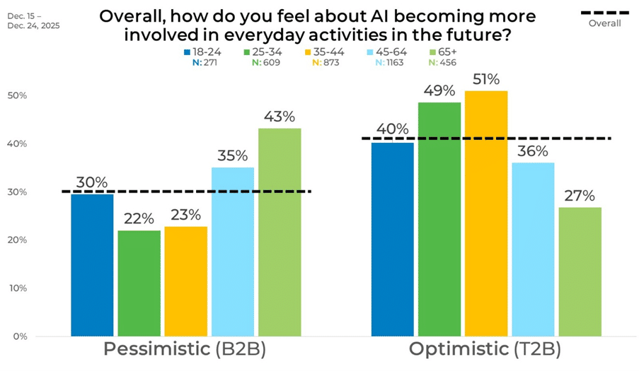 Overall, US consumer’s opinions about AI’s being involved in activities are widely spread rather than clustered at one extreme. A combined 41% express optimism, including 16% who feel very optimistic and 25% who are somewhat optimistic. Still, the largest share of respondents (29%) land squarely in the middle, saying they feel neither optimistic nor pessimistic. On the other side of the spectrum, 30% express pessimism, split evenly between those who are somewhat and very pessimistic.