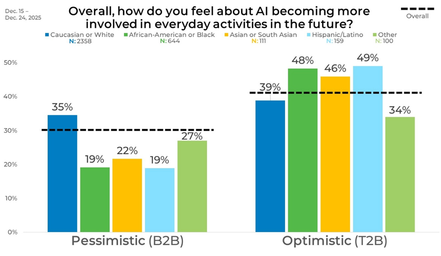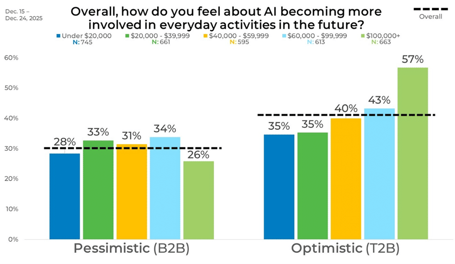 Age stands out as one of the biggest drivers in data variation. Younger and middle-aged adults tend to be the most optimistic, with 51% of those ages 35 to 44 and 49% of those ages 25 to 34 expressing positive views. Even the youngest group, ages 18 to 24, shows solid optimism at 40%. That momentum slows as age increases, dropping to 36% among those ages 45 to 64 and down to 27% among adults age 65 and older. Pessimism moves in the opposite direction, peaking at 43% among the 65+ group.