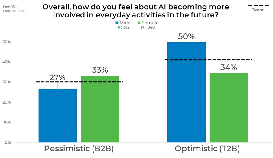 The gender split reveals a noticeable difference in tone. Men lean more positive overall, with half (50%) falling into the optimistic category, while about one-third of women (34%) say the same. Women, meanwhile, are more likely to express pessimism, with 33% in the B2B group compared with 27% of men.