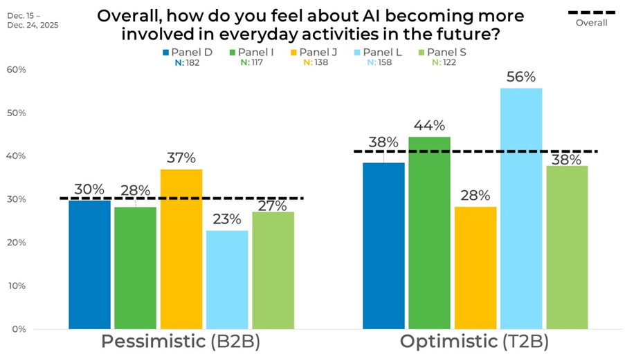 Differences in optimism and pessimism around AI’s involvement in everyday activities is really highlighted when we broke the data down by panel source. Panel L stands out clearly, posting the highest optimism at 56% and the lowest pessimism at 23%, while Panel J sits at the opposite end, with the lowest optimism at 28% and the highest pessimism at 37%. This creates a wide 28-point gap in optimism and a 14-point gap in pessimism between the two panels, the most pronounced spread in the data. By comparison, Panels D, I, and S cluster more closely together, with optimism ranging from 38% to 44% and pessimism staying between 27% and 30%.