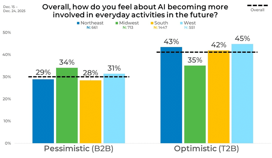 Looking at the data regionally shows similarities across geographical areas. The Midwest posts the highest pessimism at 34%, slightly ahead of the West (31%), Northeast (29%), and South (28%). On the optimistic side, the West leads with 45%, closely followed by the Northeast at 43% and the South at 42%.