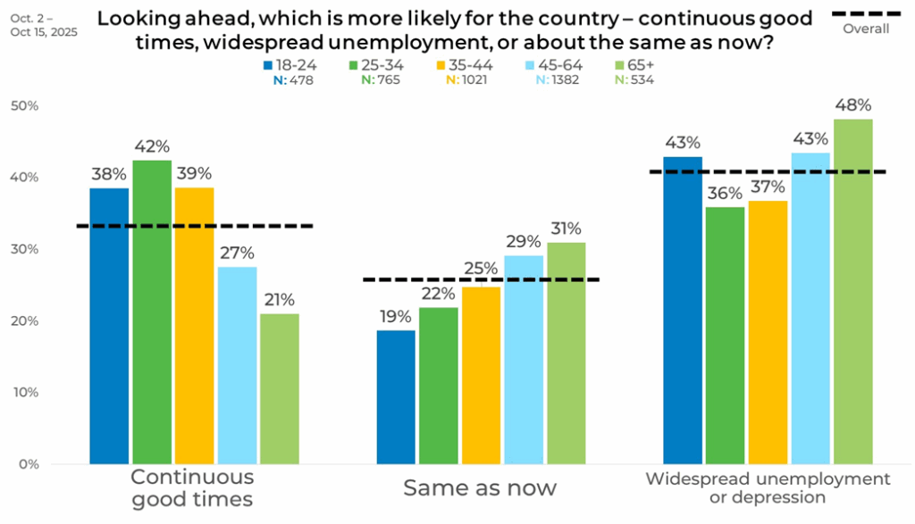 Breaking the data down by age uncovered some interesting trends. Optimism is strongest among adults aged 25–34 at 42% and lowest among those 65+ at 21%. Expectations of unemployment or depression are highest among adults 65+ at 48%, while younger adults aged 18–24 and those 35–44 both stand at 43% and 37%.