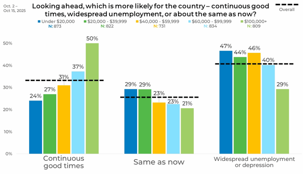 Income levels show some of the most striking contrasts. Optimism rises steadily with income, from 24% among those earning under $20,000 to 50% among those earning $100,000 or more. In contrast, expectations of unemployment or depression are highest among the lowest-income group at 47% and lowest among the highest-income group at 29%.