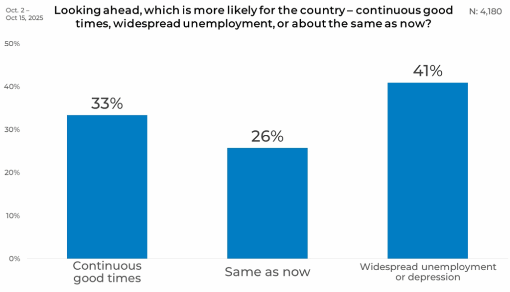 Overall, 33% of respondents expect continuous good times, while 41% anticipate widespread unemployment or depression. Another 26% believe conditions will remain about the same.