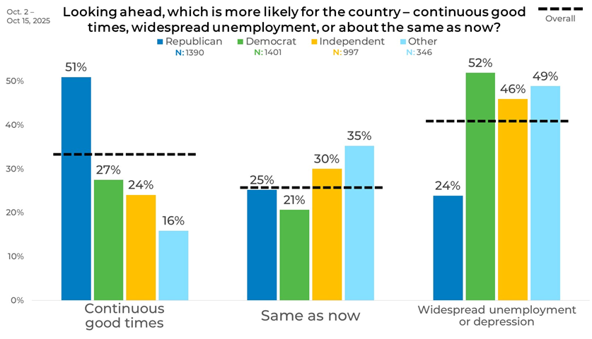Political affiliation shows wide variation in people’s expectations of the future. Republicans lead in optimism, with 51% expecting continuous good times, compared to 27% of Democrats, and 24% of Independents. Democrats are most likely to expect unemployment or depression at 52%, followed by Independents at 46%, and Republicans at 24%.