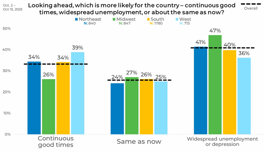 Expectations for continuous good times range from 26% in the Midwest to 39% in the West, with the Northeast at 34% and the South at 34%. Anticipation of unemployment or depression is highest in the Midwest at 47% and lowest in the West at 36%. The “same as now” response stayed relatively steady, with 24% in the Northeast, 27% in the Midwest, 26% in the South, and 25% in the West.