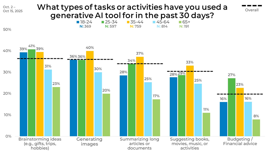 Age clearly plays a role in how generative AI is used. Brainstorming ideas is reported by 39% of adults ages 18–24 and 41% of those ages 25–34, before dropping to 31% among ages 45–64 and 23% among those 65 and older. Generating images follows a similar pattern, peaking at 40% among ages 35–44 and falling to 20% among those 65+.