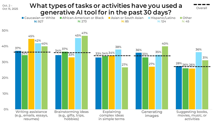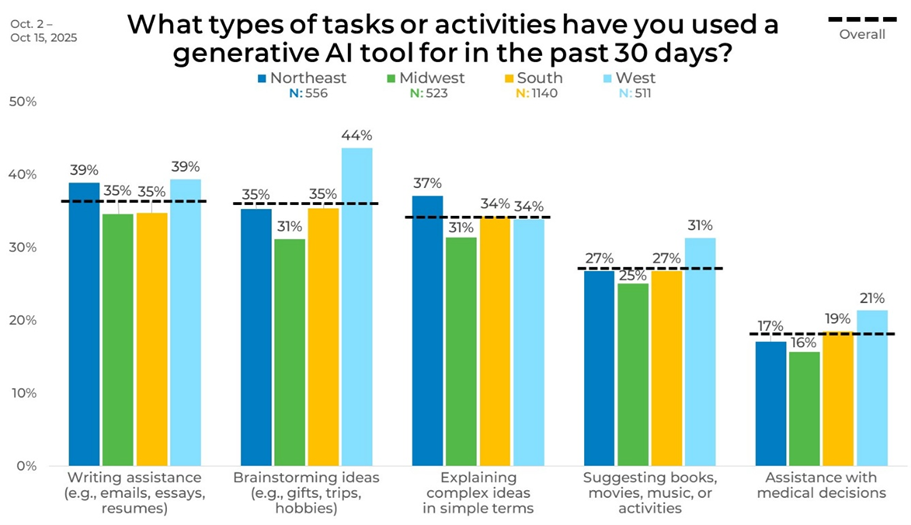 Regional differences show a few clear standouts in how people are using generative AI. Writing assistance is highest in the Northeast and West at 39%, compared with 35% in the Midwest and South, while brainstorming ideas peaks in the West at 44%, compared with 31% in the Midwest.