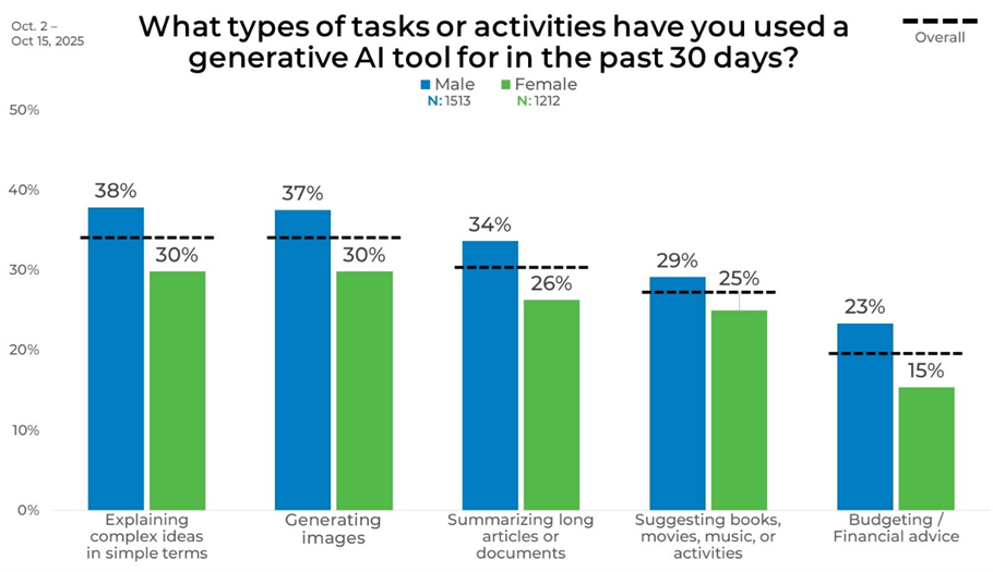 Gender differences are most pronounced in information-intensive and creative tasks. Men report higher usage than women for explaining complex ideas (38% vs. 30%), generating images (37% vs. 30%), and summarizing long documents (34% vs. 26%). These gaps indicate a stronger concentration among men in tasks related to content processing and visual creation.