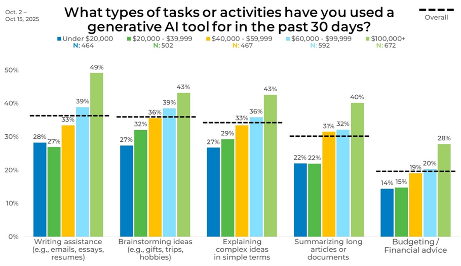 Looking at the data by income identified some differences in generative AI usage. Writing assistance rises from 28% among those earning under $20,000 to 49% among those earning $100,000 or more. Brainstorming ideas follows the same upward pattern, increasing from 27% in the lowest-income group to 43% in the highest-income group.