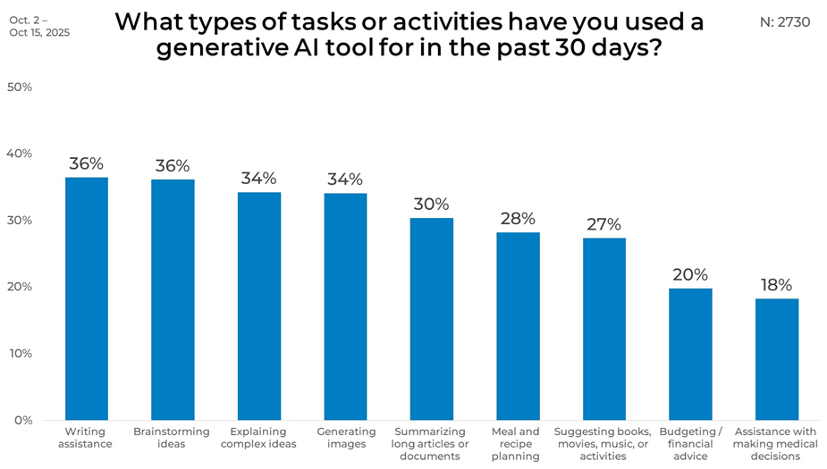 January 13, 2026When asking people if they use Generative AI tools, the natural follow-up is what they are doing with it. In part 3 of our series on AI familiarity and usage, we explore how people are using generative AI.