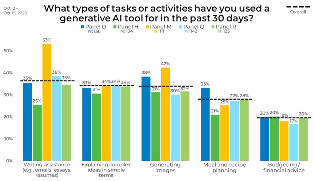Panel differences are most pronounced for writing assistance and image generation, with writing assistance ranging from 25% in Panel H to 53% in Panel M and image generation spanning 30% in Panel Q to 42% in Panel M. Other activities remain tightly aligned by comparison, as explaining complex ideas stay between 31% and 34% and budgeting holds within a narrow 17% to 20% range.