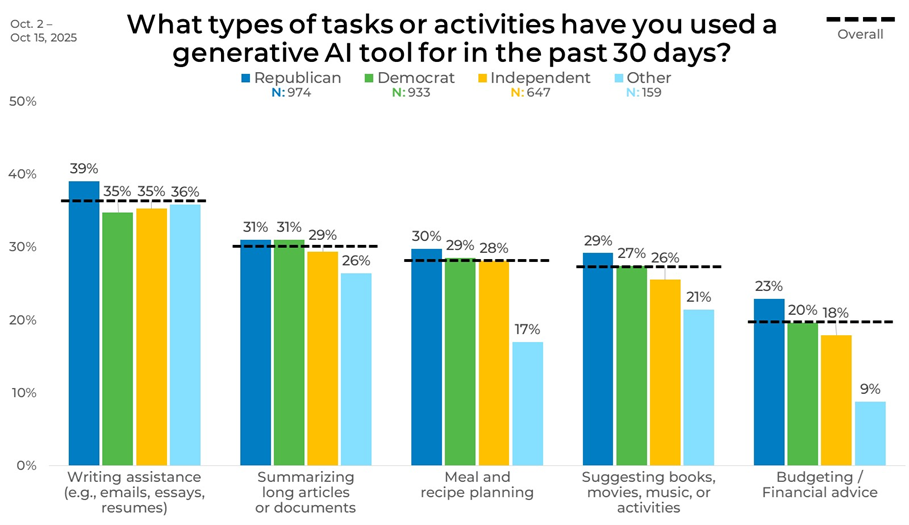 Generative AI usage is largely consistent across political affiliation. Writing assistance is used by 39% of Republicans and 35% of both Democrats and Independents, while summarizing long content stays near 30% across groups. Meal and recipe planning also varies little, ranging from 28% to 30%.
