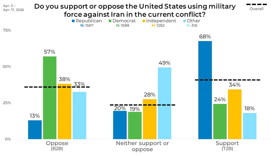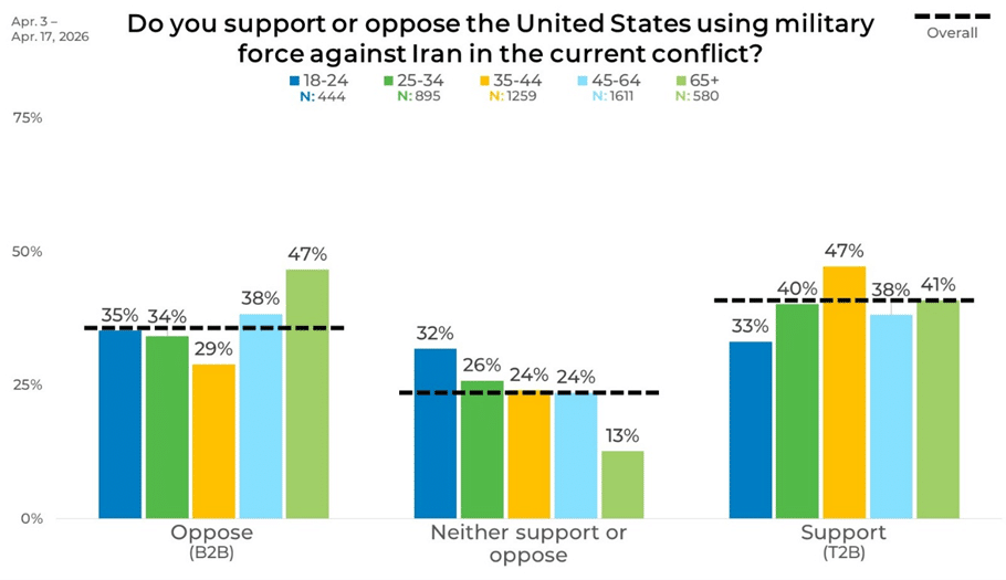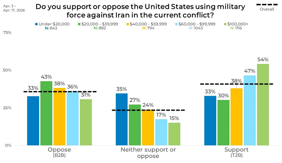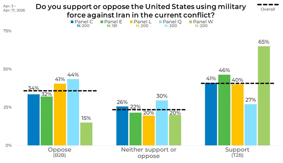 April 20, 2026On February 28, 2026, the United States began military strikes on Iran. These strikes have caused ripples globally and have been divisive among US consumers. We wanted to better gauge the levels of support people currently have for the military operations, so we asked them in our most recent round of research-on-research.