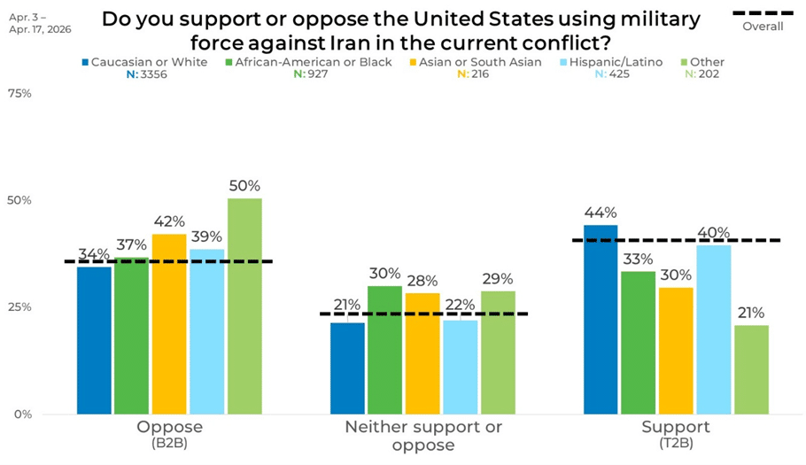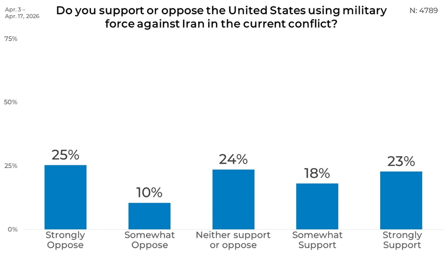 Opinions on the use of military force against Iran are relatively evenly distributed among all US consumers. Opposition accounts for 35% of responses when combining strongly and somewhat oppose, while 41% fall into the support category.