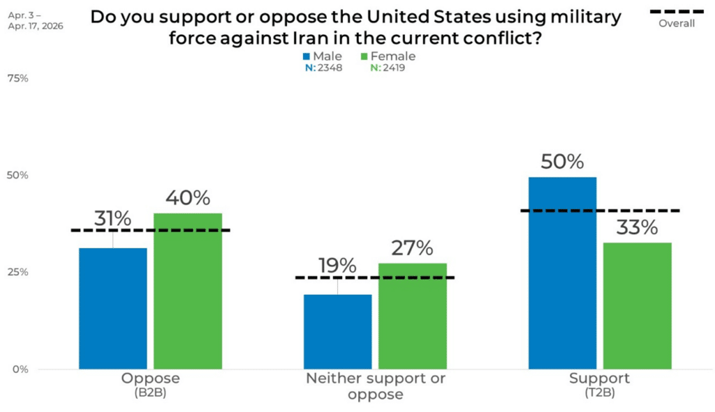Segmenting the data by gender highlights a clear pattern around support for the military action in Iran. Among men, half of respondents (50%) fall into the support category, compared with 33% of women. Opposition is also more common among women, with 40% in the B2B group versus 31% among men.